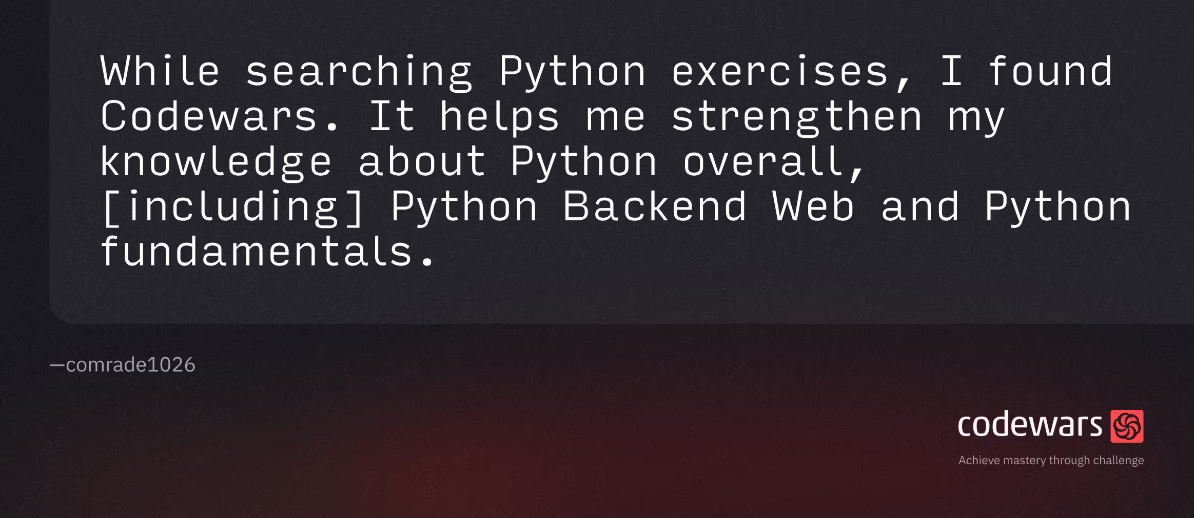 "While searching Python exercises, I found Codewars. It helps me strengthen my knowledge about Python overall, [including] Python Backend Web and Python fundamentals." - comrade1026
