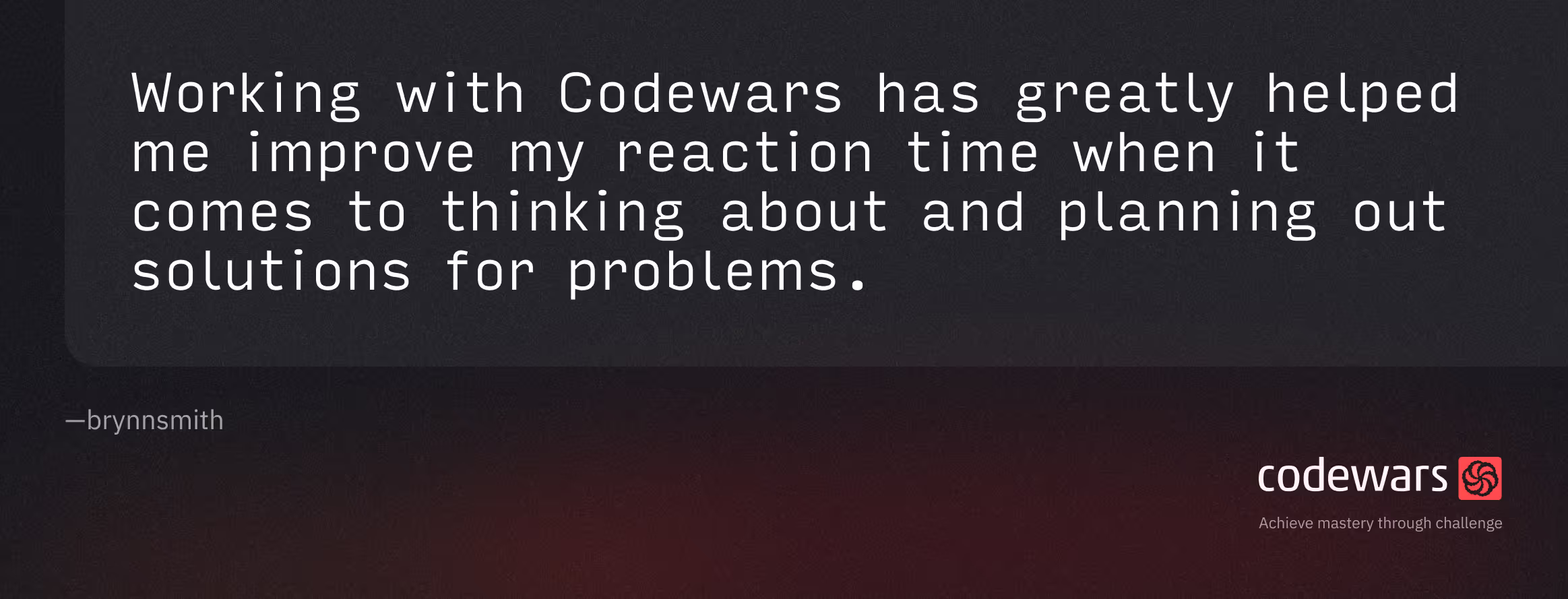"Working with Codewars has greatly helped me improve my reaction time when it comes to thinking about and planning out solutions for problems." - brynnsmith