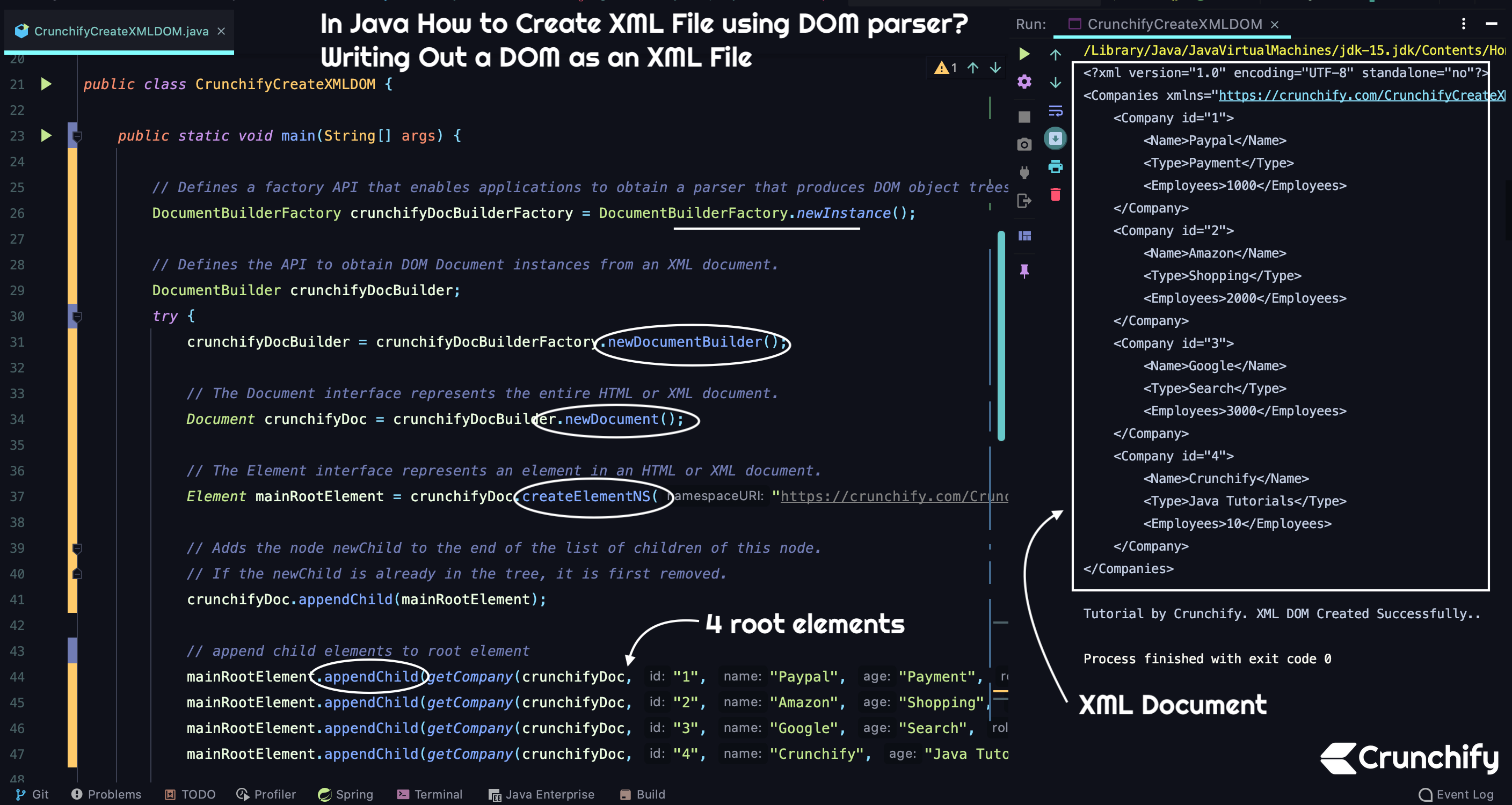 <?xml version="1.0" encoding="UTF-8" standalone="no"?> <Companies xmlns="https://crunchify.com/CrunchifyCreateXMLDOM"> <Company id="1"> <Name>Paypal</Name> <Type>Payment</Type> <Employees>1000</Employees> </Company> <Company id="2"> <Name>Amazon</Name> <Type>Shopping</Type> <Employees>2000</Employees> </Company> <Company id="3"> <Name>Google</Name> <Type>Search</Type> <Employees>3000</Employees> </Company> <Company id="4"> <Name>Crunchify</Name> <Type>Java Tutorials</Type> <Employees>10</Employees> </Company> </Companies> Tutorial by Crunchify. XML DOM Created Successfully.. Process finished with exit code 0