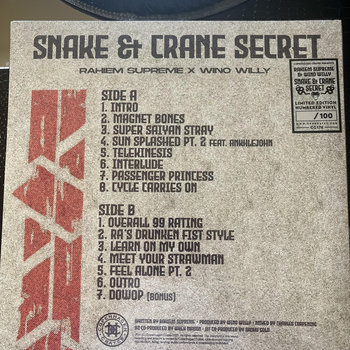 When Rahiem speaks of New Orleans producer Wino Willy, there’s an air of wide-eyed reverence in his voice. “He got a certain type of head knock to his shit,” he says. “It’s boom-bap, but I couldn’t find another producer that made boom-bap with that kind of knock.” Snake & Crane Secret is one of Rahiem’s grimiest works and bears perhaps his heaviest resemblance to Ghostface. Wino Willy’s beats snap and crumble in equal measure, reminiscent of Wu affiliates like 4th Disciple and True Master. “Sun Splashed Pt. 2” with fellow D.C. heavyweight Ankhlejohn is a particular highlight.