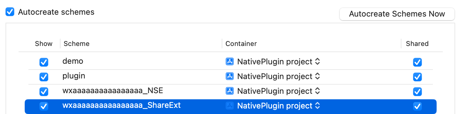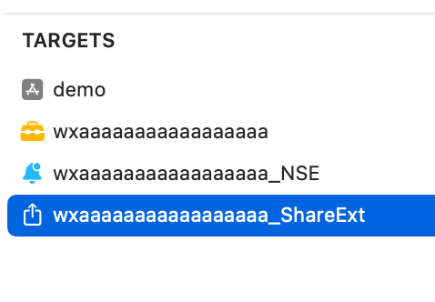 但是为了能在donut中使用,需要将 appex 编译的 scheme 和 target 名字设置为plugin id 开头的内容。在构建plugin的时候会将编译的appex产物上传。