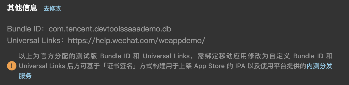 1、多端应用需配置自定义的 Bundle ID,即如你的多端应用当前仍使用官方分配的默认的测试版 Bundle ID,不可使用内测分发服务;详情可看多端应用 Bundle ID 配置