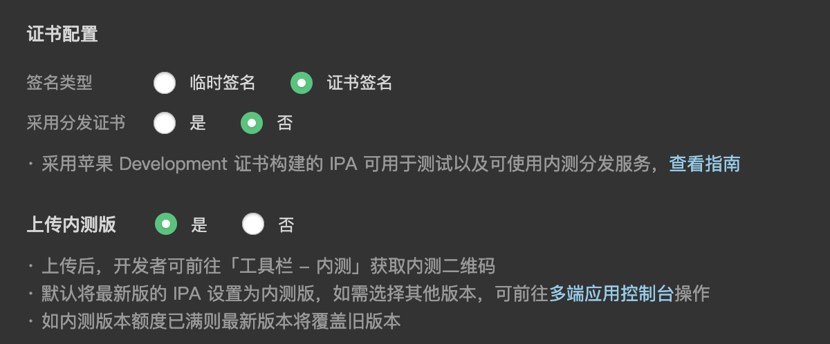 2、构建 IPA 时需选择「证书签名」,且证书不能是「分发证书」,详情可查看生成内测分发的 iOS 证书和 Provisioning Profile