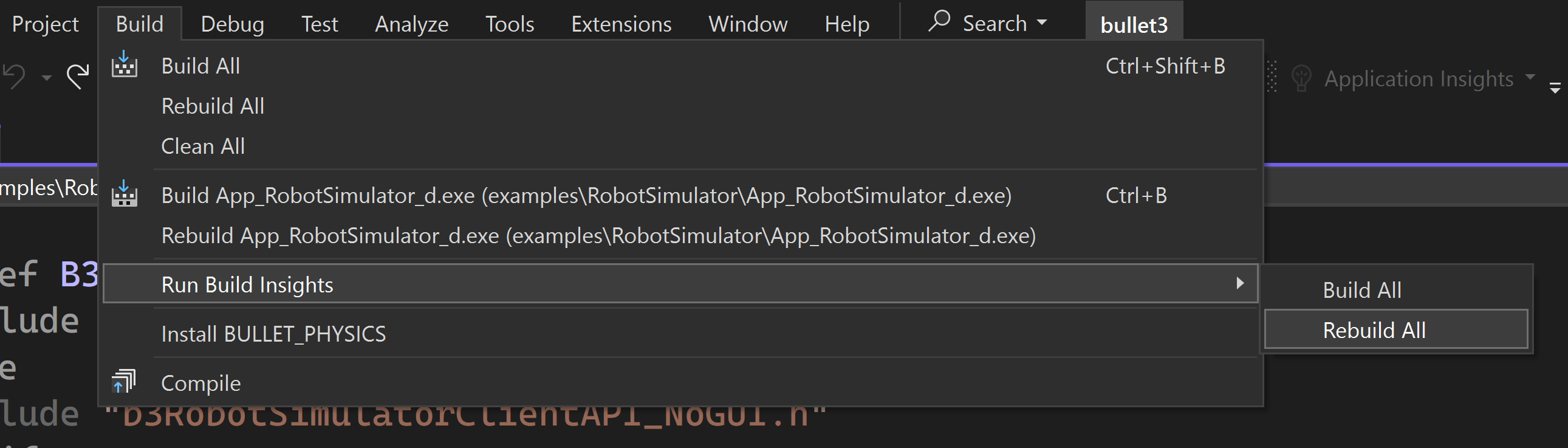 This tool provides insights into the Include File and Include Tree views to analyze and optimize your #include usage. For instance, in the bullet3 sample repository, running Build Insights reveals that the overall build time of our current project is 202.812 seconds.