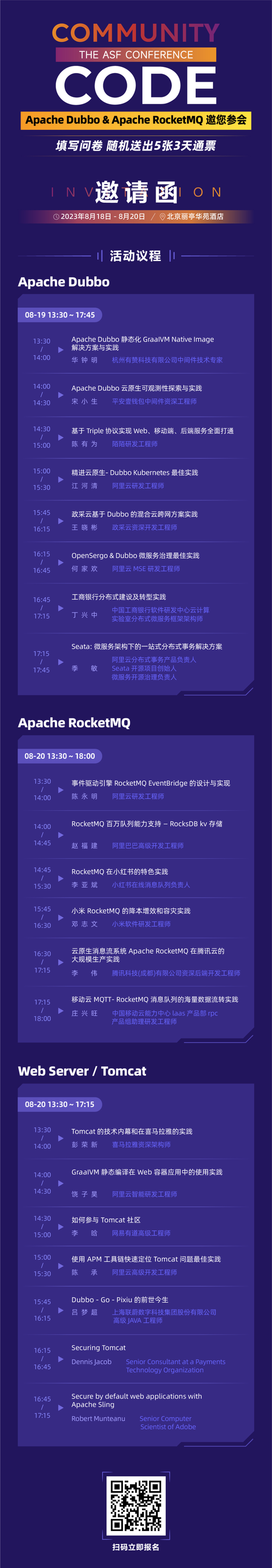 今年,CommunityOverCode Asia 2023 将是阿帕奇亚洲大会的首次线下会议,北京,8 月 18 日至 20 日。会议将持续 3 天,设有 17 个论坛方向,共收集到 150 余个议题投稿,其中中文议题约 110 个,英文议题近 40 个。Apache Dubbo 和 Apache RocketMQ 邀请您来参会,点击阅读原文或扫描下方海报的二维码、填写问卷,有机会免费获得 3 天通票。