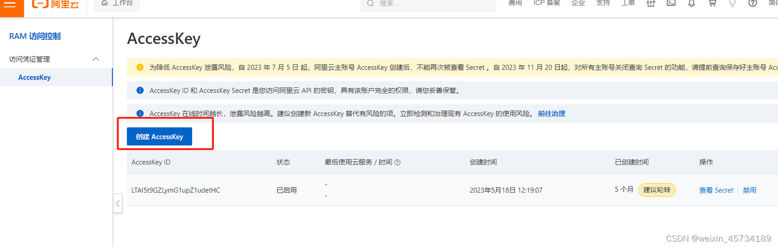 在阿里云AccessKey管理板块,获取或者创建AccessKey。