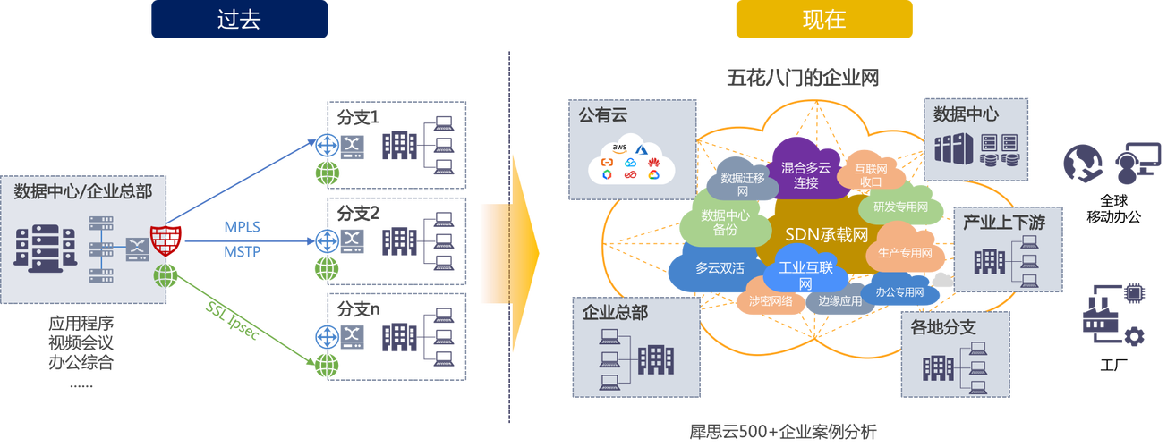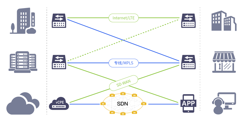 复合型技术方案:SD-WAN、互联网VPN,适用连接和访问的多个应用场景。