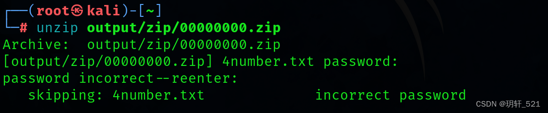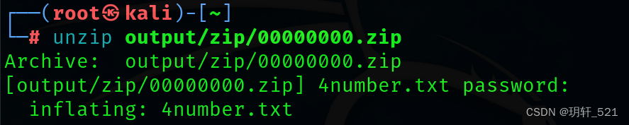 5、解压zip文件需要密码,尝试几个常用的密码后还是不行。使用工具fcrackzip进行暴力破解,得到密码7639,正好对应之前4number.txt的文件名。