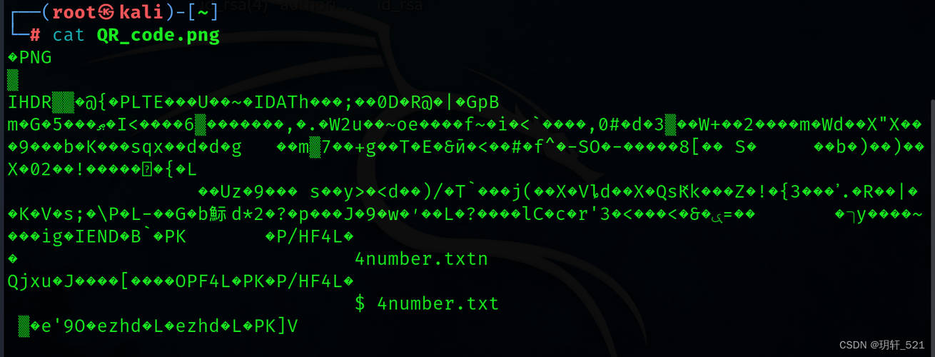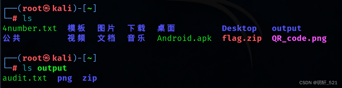 4、使用Kali中的foremost工具,分离出QR_code.png中的压缩文件,使用ls命令查看,得到一个output目录,查看output目录下的文件,找到zip文件。