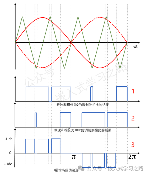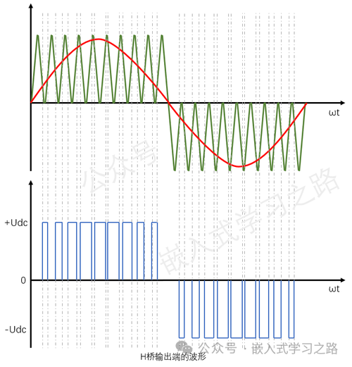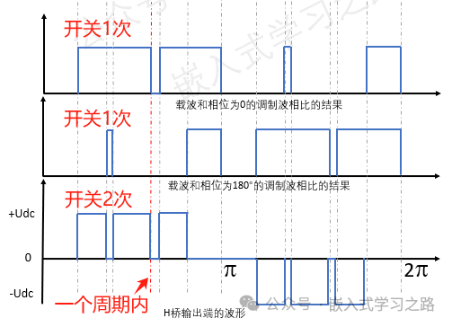 2、从H桥输出的波形来看,当载波和相位为0和180°的正弦波比较时,会分别产生上图示波形,两个波形分别作用到H桥的两个桥臂上时,H桥的输出的波形就是两个波形的差,即图1的波形减去图2的波形等于图3的波形,从输出的波形上来看,在同一个周期内,开关次数是桥臂PWM的2倍,因此倍频在这里,当桥臂输入10KHz的SPWM时,H桥就能输出20KHz的频率。再看下面这张图就更明了了。