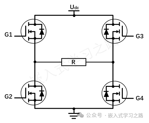 此时负载R的电压变化是直接从+Udc变换到-Udc,变化幅度很大。而我们在布线的时候难免会有分布电容的存在,此时Δdu/Δdt就会有电流产生作用在管子上,容易导致管子损坏。