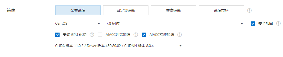 AIACC-Inference(AIACC推理加速)依赖GPU驱动、CUDA和cuDNN,请在创建GPU实例时,选中安装GPU驱动和AIACC推理加速,然后选择CUDA、Driver和cuDNN的版本。GPU实例创建完成后,您可以根据CUDA版本快速配置包含AIACC-Inference(AIACC推理加速)的Conda环境。创建GPU实例的具体操作,请参见创建配备GPU驱动的GPU实例(Linux)。