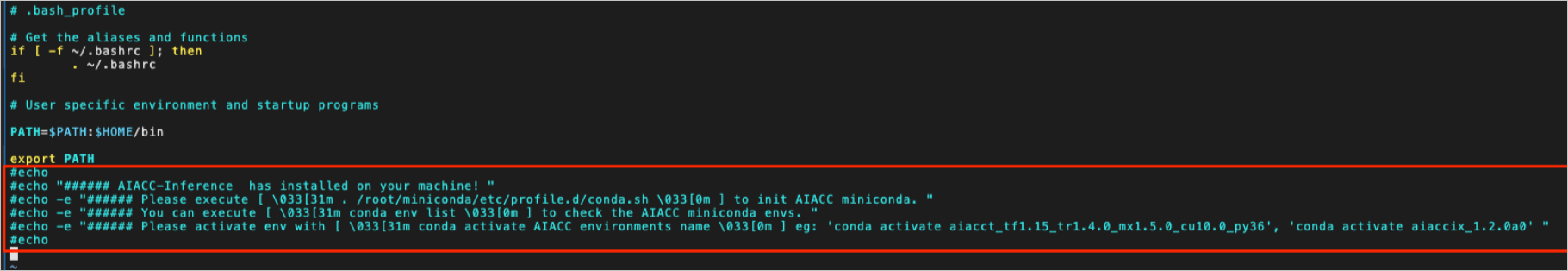 - 修改文件/root/.bash_profile,注释Miniconda、AIACC-Inference(AIACC推理加速)相关的环境变量和回显。