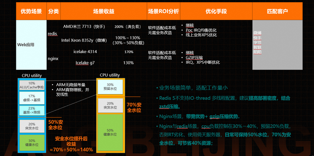 - Nginx与redis场景,cpu负载控制在30%~40%,预留20%负载,否则RT劣化,使用倚天服务器,日常可保持50%水位,70%为安全水位,可节省40%资源;