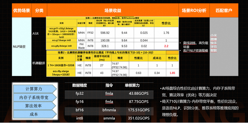 - AI场景综合性价比由计算算力、内存子系统带宽、算法效率(优化)等方面决定 。