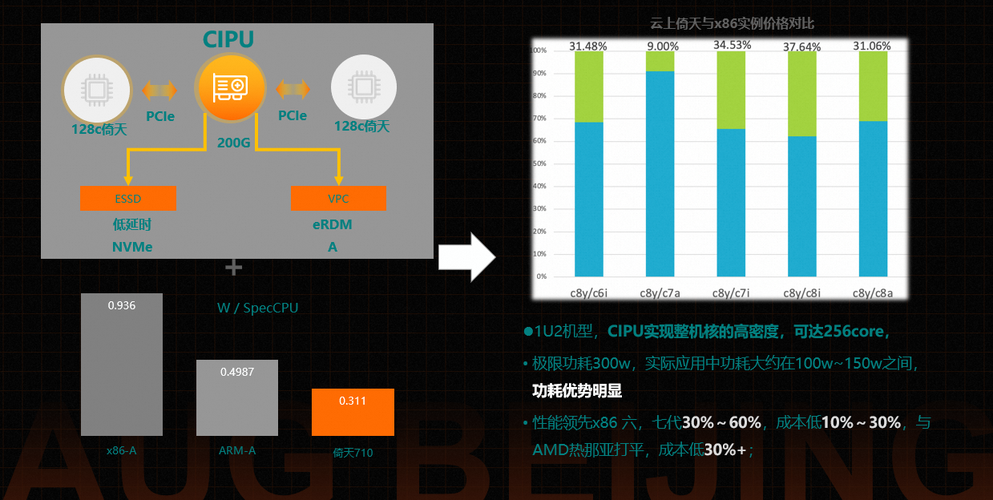 - 性能领先x86 六,七代30%~60%,成本低10%~30%,与AMD热那亚打平,成本低30%+;