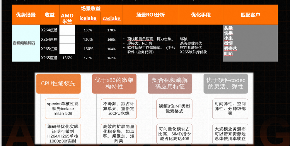 在阿里云外部客户方面,X短视频客户,基于自身业务测试视频编解码场景,性能收益高达30%以上,性价比收益高达80%+。Y游戏客户,基于自身游戏对于计算和网络的高要求,倚天c8y在客户实测中跑分是X86架构同级的120%,综合性价比近乎200%。目前基于倚天710的ECS实例已经成为了外部客户降本增效的利器。