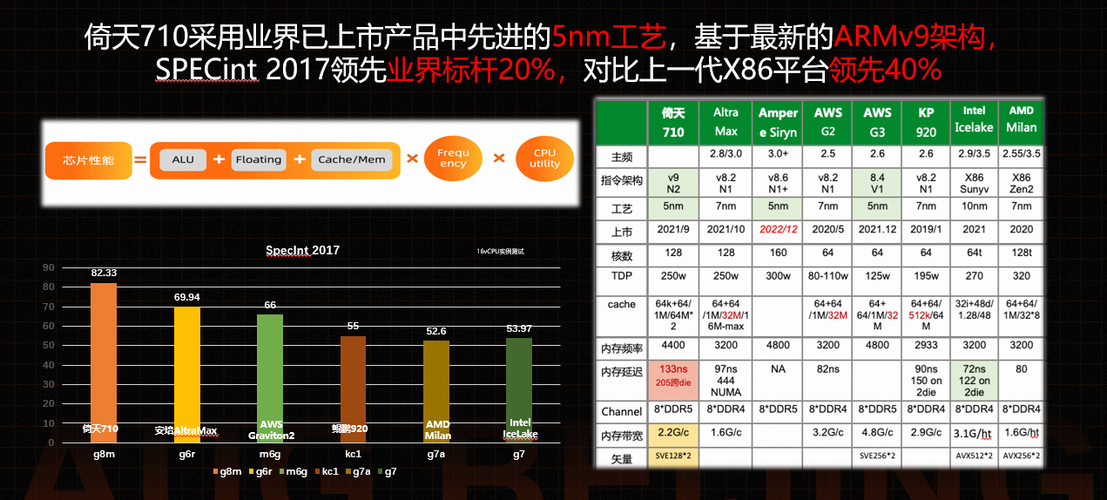 倚天710采用业界已上市产品中先进的5nm工艺,基于最新的ARMv9架构,SPECint 2017领先业界标杆20%,对比上一代X86平台领先40% 。