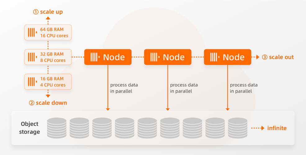 云原生存算分离架构,所有计算节点共享存储,扩容无数据迁移,新增节点可以立即参与计算。