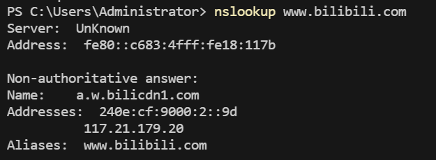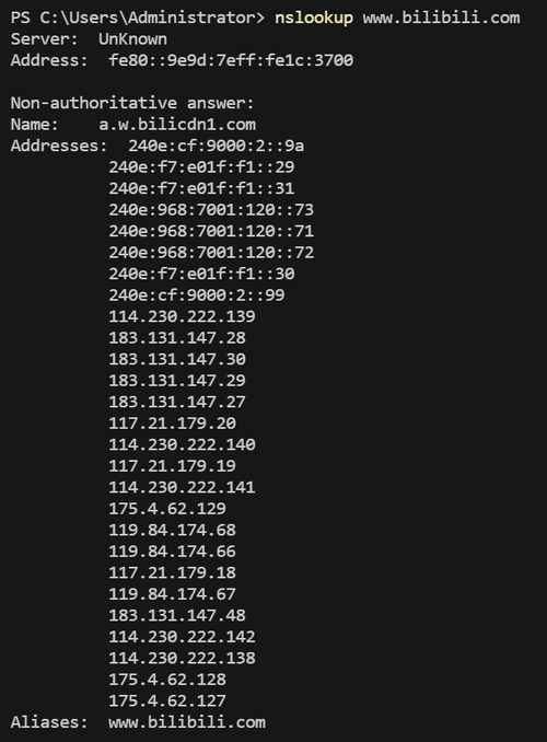 该选项带来的好处, ADG自行测试上游 DNS 的 IP 解析结果, 将其中延迟最低的 IP 返回给下游客户端. 以下是bilibili的常规解析结果.