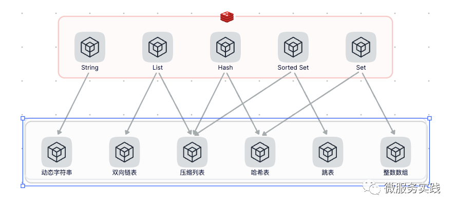 缓存是高并发服务的基础,毫不夸张的说没有缓存高并发服务就无从谈起。本项目缓存使用Redis,Redis是目前主流的缓存数据库,支持丰富的数据类型,其中集合类型的底层主要依赖:整数数组、双向链表、哈希表、压缩列表和跳表五种数据结构。由于底层依赖的数据结构的高效性以及基于多路复用的高性能I/O模型,所以Redis也提供了非常强悍的性能。下图展示了Redis数据类型对应的底层数据结构。