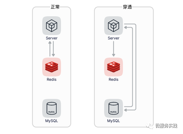 缓存击穿是指访问某个非常热的数据,缓存不存在,导致大量的请求发送到了数据库,这会导致数据库压力陡增,缓存击穿经常发生在热点数据过期失效时,如下图所示: