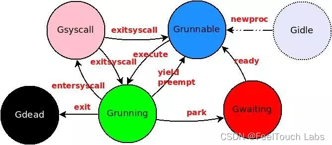 以面是一张goroutine的状态迁移图,圆形框表示状态,箭头及文字信息表示切换的方向和条件: