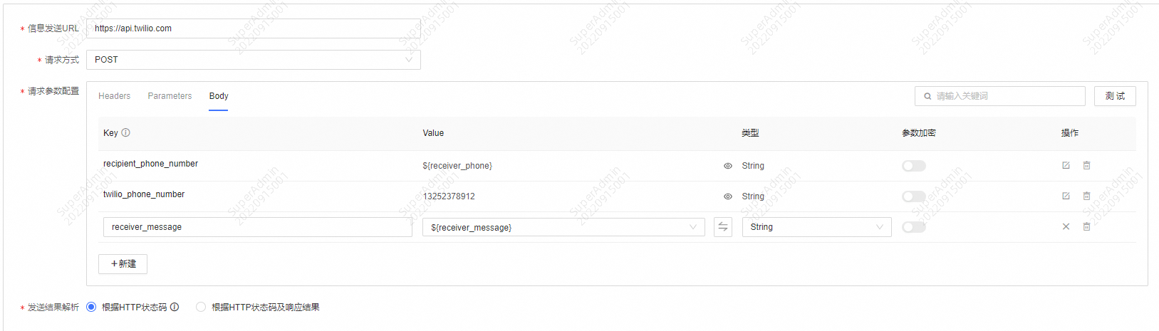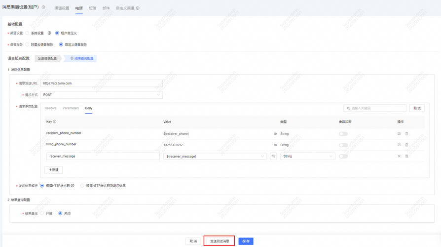 ③${receiver_message}即为消息模板中的内容,中间的参数会根据Dataphin中的实际情况进行传参,并发送给Twilio API中的TWIML_URL,从而完成请求