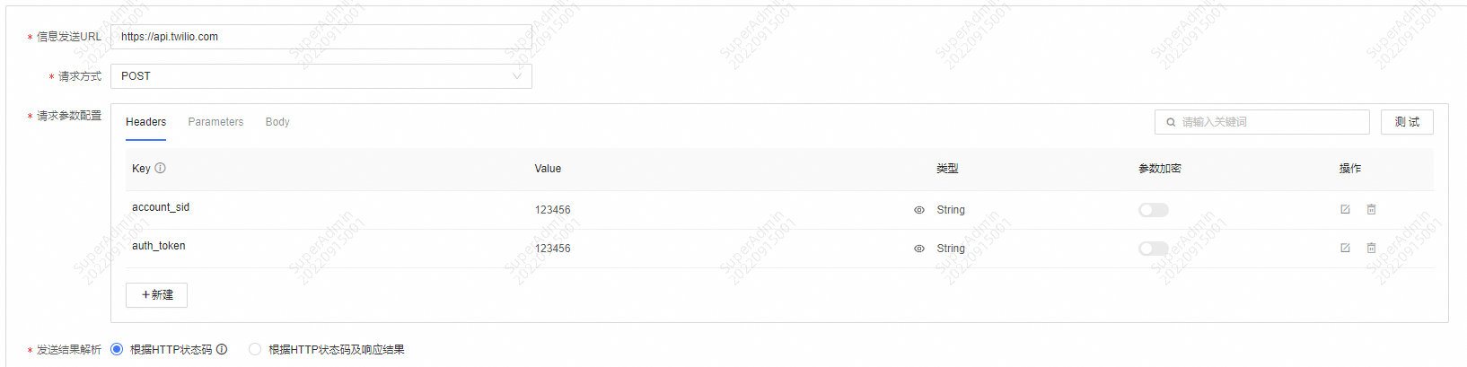 ①ACCOUNT_SID和AUTH_TOKEN是调用Twilio API所必须的账号SID和认证令牌,我们可以放在headers里面