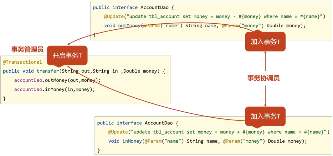 - 事务协调员:案例中的数据层事务。加入事务方,在Spring中通常指代数据层方法,也可以是业务层方法