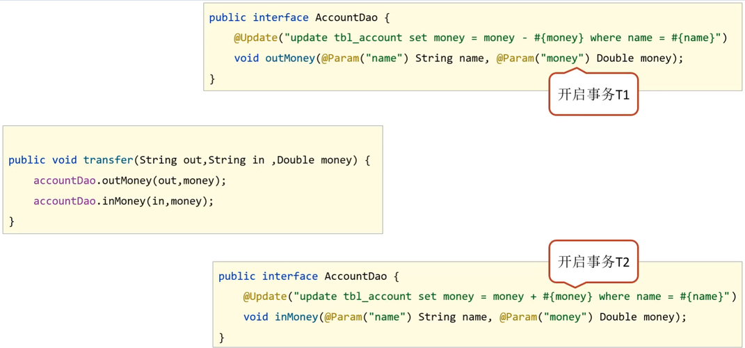 - AccountDao的outMoney因为是修改操作,会开启一个事务T1