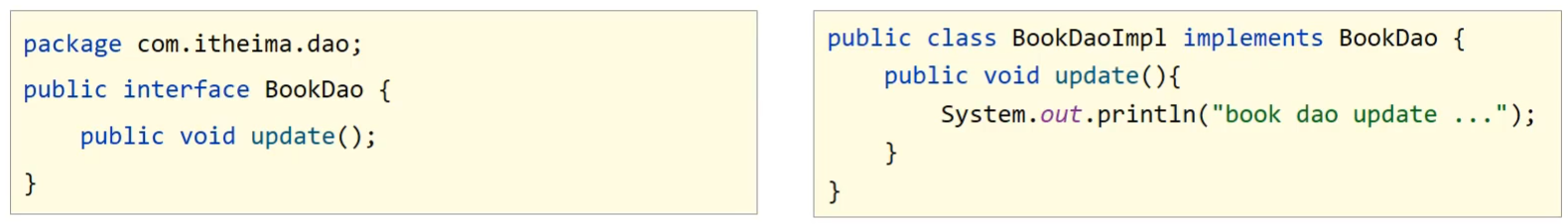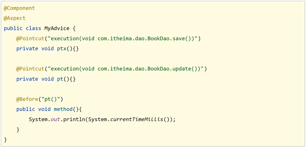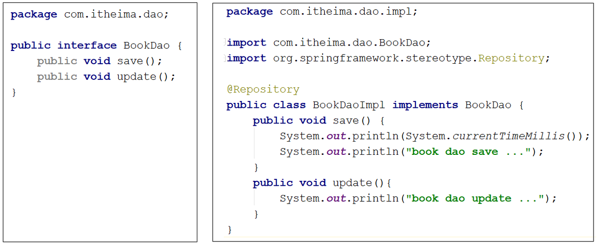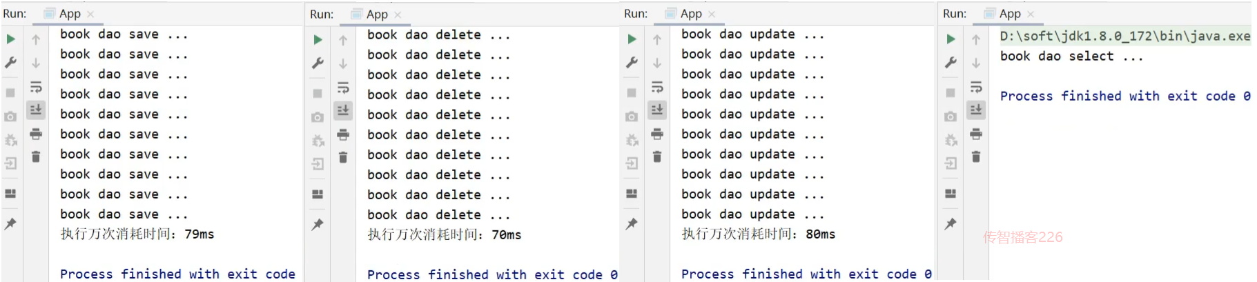 @Repository public class BookDaoImpl implements BookDao { public void save() { //记录程序当前执行执行(开始时间) Long startTime = System.currentTimeMillis(); //业务执行万次 for (int i = 0;i<10000;i++) { System.out.println("book dao save ..."); } //记录程序当前执行时间(结束时间) Long endTime = System.currentTimeMillis(); //计算时间差 Long totalTime = endTime-startTime; //输出信息 System.out.println("执行万次消耗时间:" + totalTime + "ms"); } public void update(){ System.out.println("book dao update ..."); } public void delete(){ System.out.println("book dao delete ..."); } public void select(){ System.out.println("book dao select ..."); } }