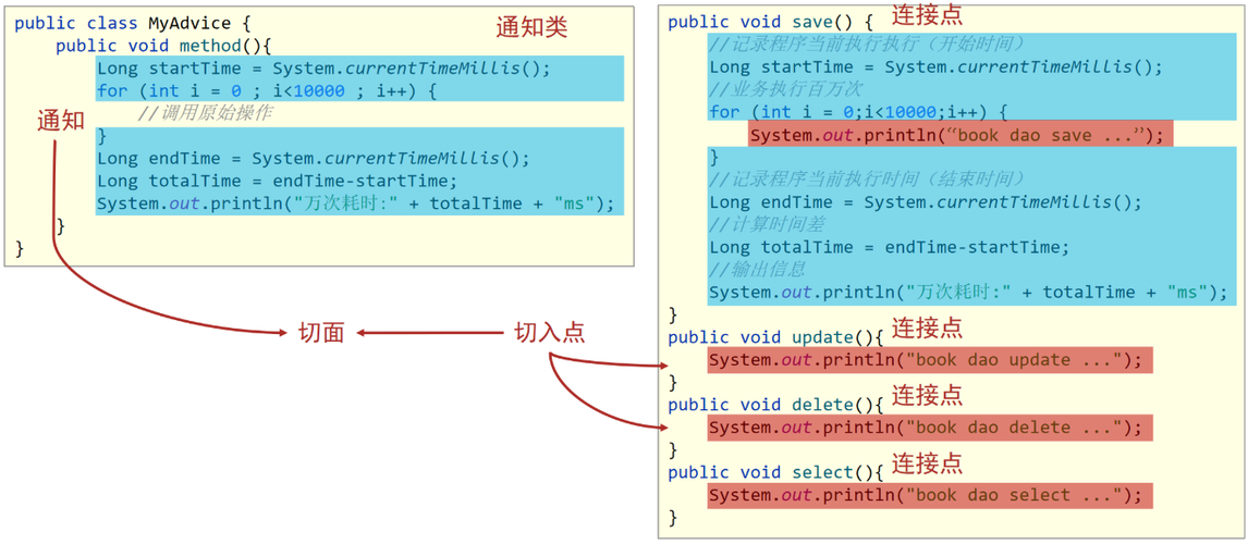 (3)执行BookServiceImpl的update和delete方法的时候都被添加了一个计算万次执行消耗时间的功能,将这个功能抽取到一个方法中,换句话说就是存放共性功能的方法,我们起名叫通知