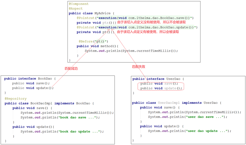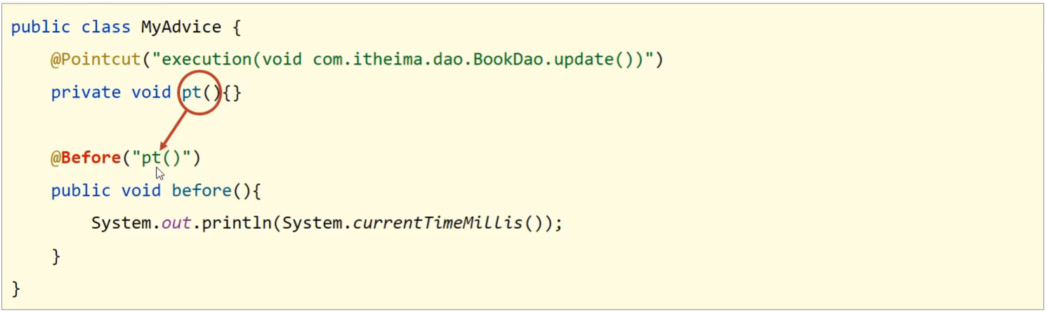- 切面(Aspect):描述通知与切入点的对应关系。把通知和切入点绑定到一块,一个通知对应一个切入点。例如切面是Before,即通知在切入点之前运行。