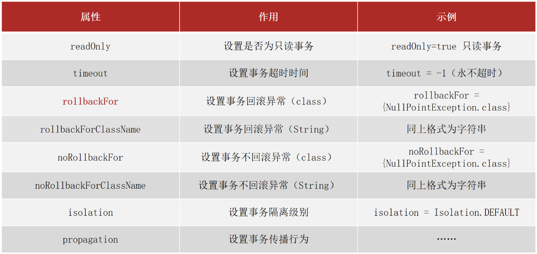 - noRollbackForClassName等同于noRollbackFor,只不过属性为异常的类全名字符串