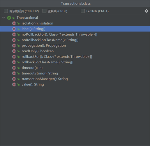 ctrl+b跟进Transaction注解,Ctrl+f12查看属性: