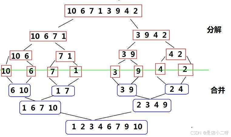 由于快速排序采用是前序遍历满足栈相关数据结构的特性,然后归并排序属于后序排序因此不是通过使用栈区模拟非递归实现归并排序。如果采用栈去模拟实现非递归归并排序,由于归并排序不像快速排序不是出栈既排序,而是等到栈为空,开始归并排序,然而没有归并操作这种做法。