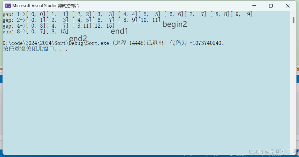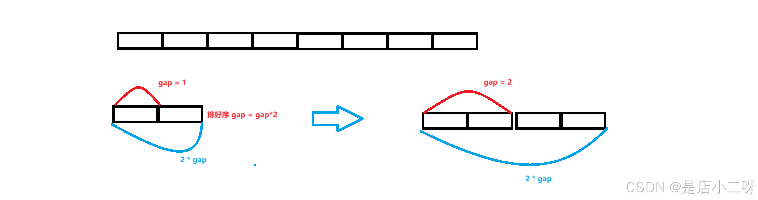 int begin1=i,end1=i+gap-1; int begin2=i+gap,end2=i+2*gap-1; [begin1,end1][begin2,end2]归并