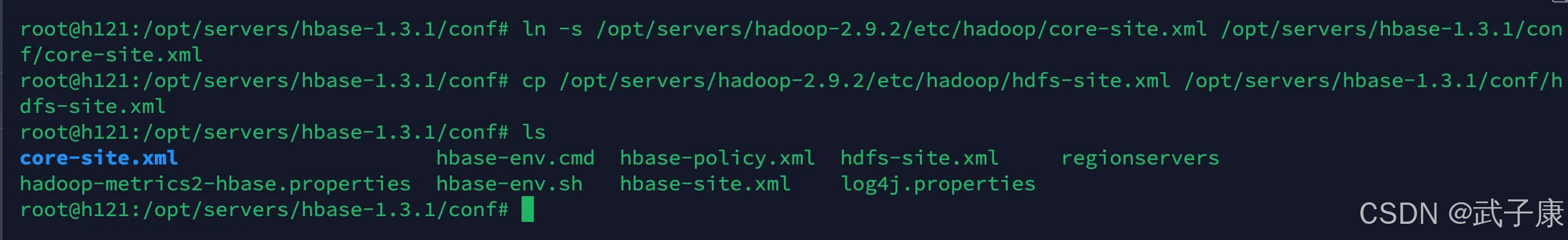 ln -s /opt/servers/hadoop-2.9.2/etc/hadoop/core-site.xml /opt/servers/hbase-1.3.1/conf/core-site.xml cp /opt/servers/hadoop-2.9.2/etc/hadoop/hdfs-site.xml /opt/servers/hbase-1.3.1/conf/hdfs-site.xml