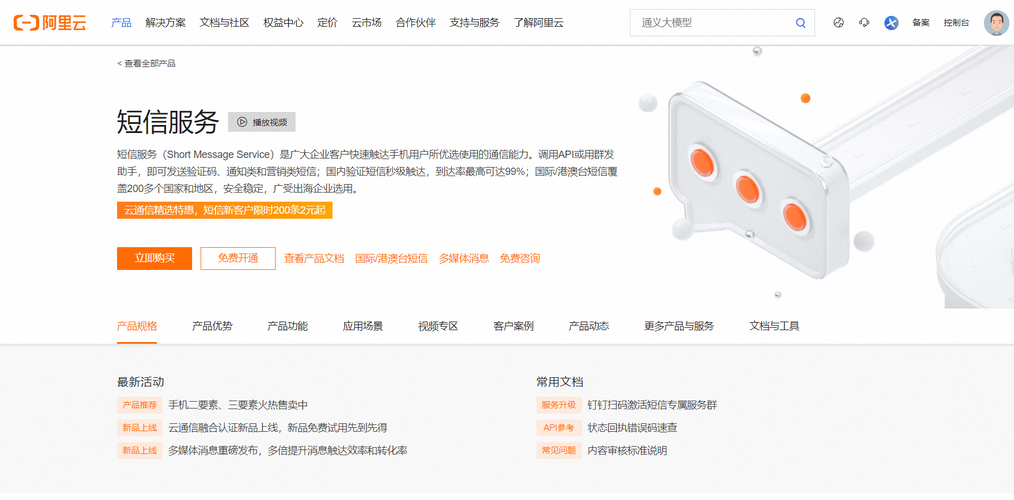 短信服务(Short Message Service)是阿里云为广大企业用户或个人用户提供的通信服务。通过API/SDK、控制台调用短信发送能力,将指定信息发送至国内或境外手机号码。可以在不同场景发送不同类型的短信,例如验证码、通知短信、推广短信以及多媒体短信等。