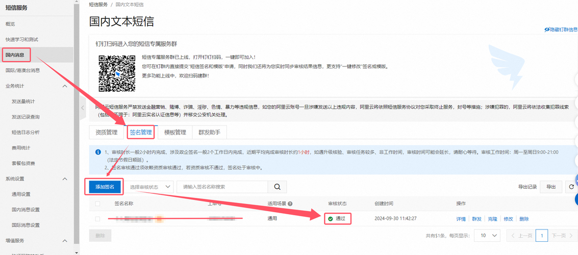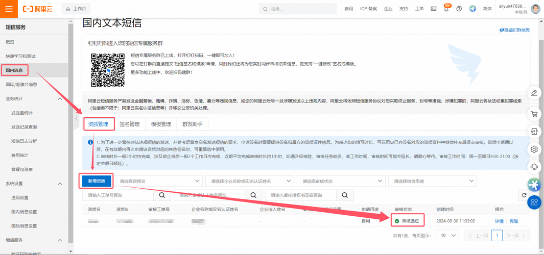 在 短信服务控制台 中申请资质、测试签名、测试模板。