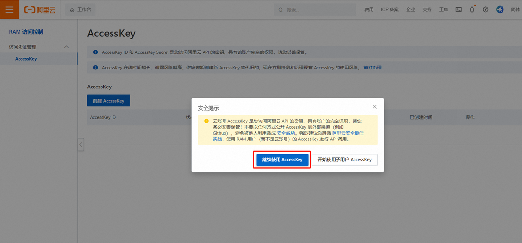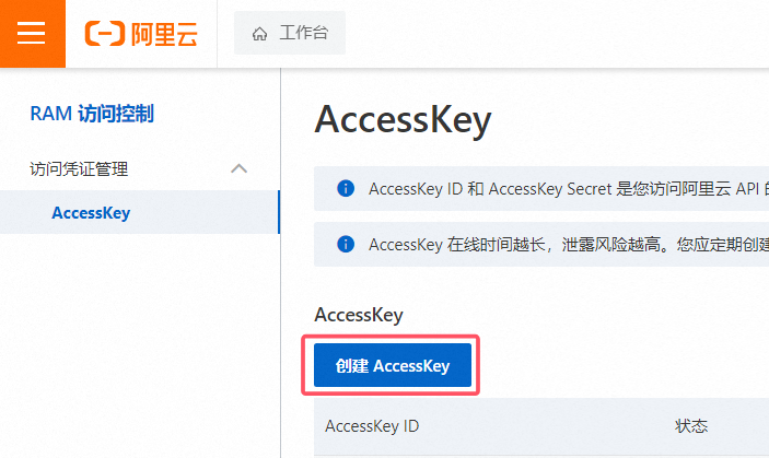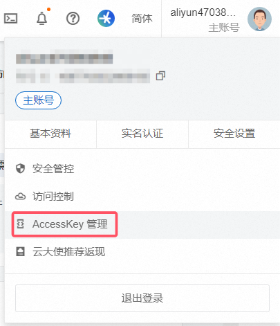 在阿里云网站上的个人中心配置Accesskey,查询AccessKeyld和AccesskeySecret。