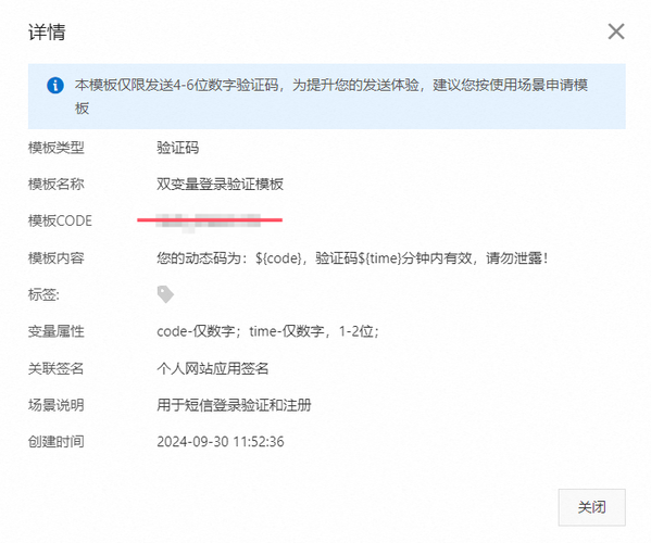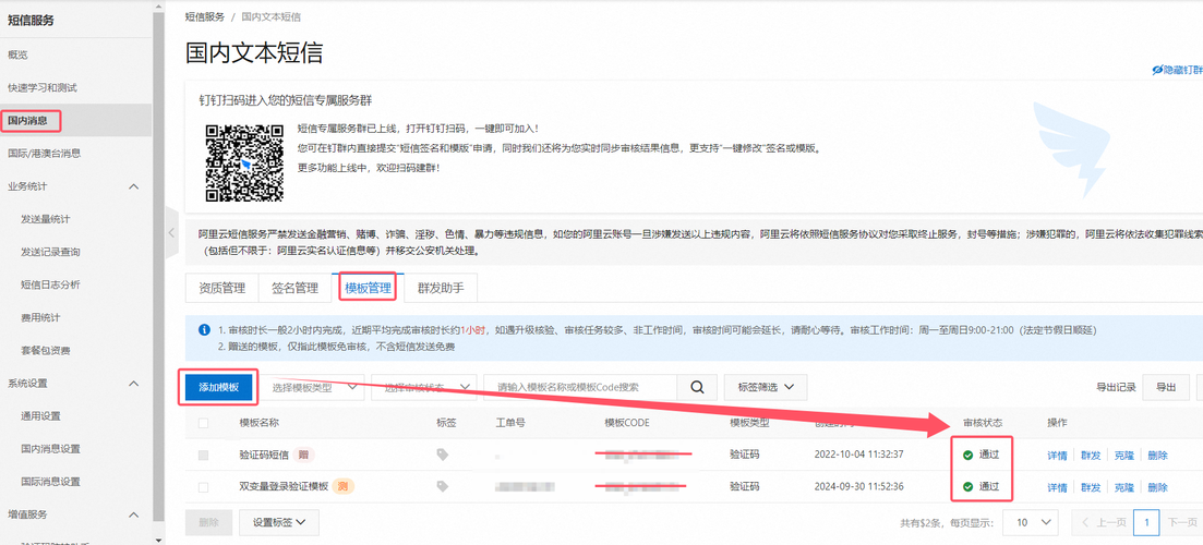 - 在模板管理中添加短信模板,根据自己的需求填写即可,这边使用了一个双变量模板。