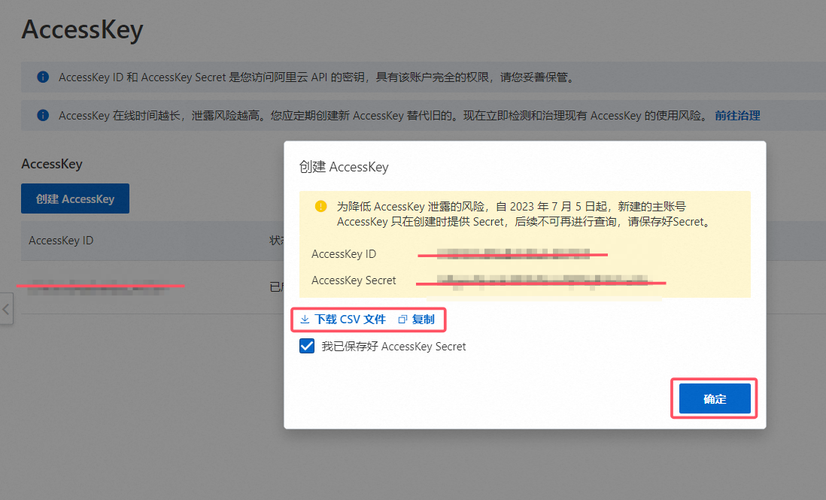 注意:通过安全验证后可以看到生成的accessKeyld和accessKeySecret,大家下载csv文件或者复制下来,因为accessKeySecret只显示一次,点击确定后将不再显示!