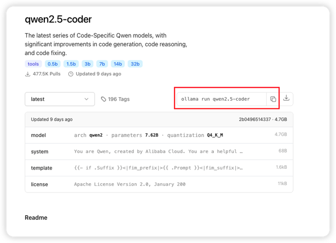 打开 https://ollama.com/library/qwen2.5-coder 选择合适自己的模型,一般默认就是7b-instruct 的版本。我下载的是 32b 版本的,爱折腾的人可以看看各个量化版本效果。