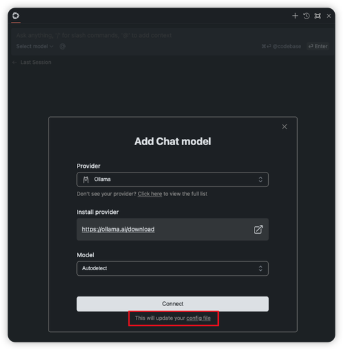 点击最下面 config 文件自定义编辑,也可以选择你下载好 qewn2.5-coder, 点击 connect。