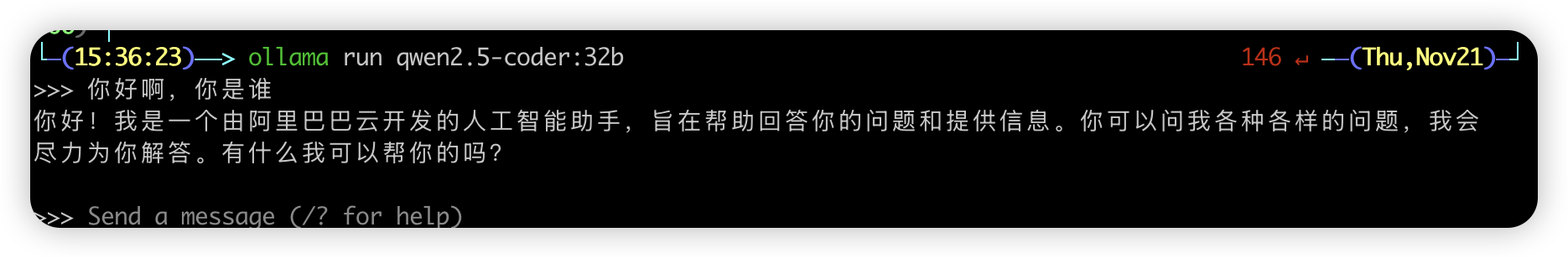 ollama run qwen2.5-coder 回车执行命令后, ollama 会自动去下载 7b 模型 (网络问题自己解决),下载完后会自动进入对话,你可以任意输入中文或英文,会看到自动回复。输入/bye 命令,即可退出。