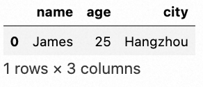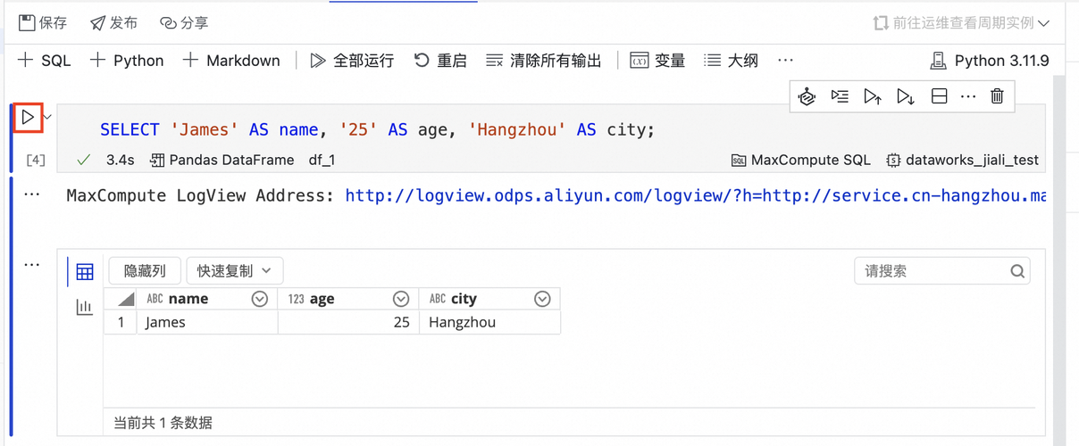 SELECT 'James' AS name, '25' AS age, 'Hangzhou' AS city; - 再次点击执行SQL,可得到执行结果