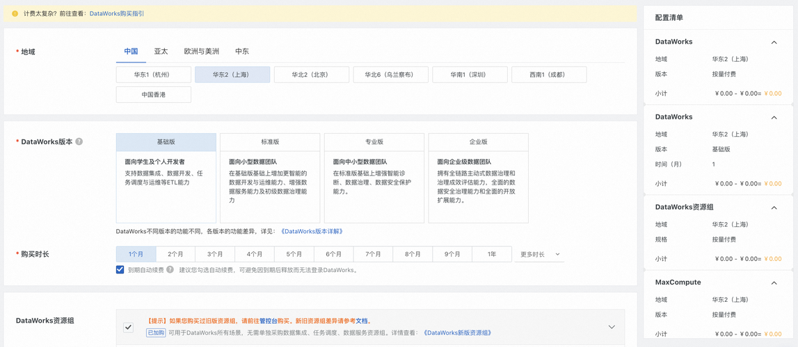 开通会默认开通DataWorks按量付费、DataWorks基础版1个月、Dataworks资源组按量付费、MaxCompute按量付费