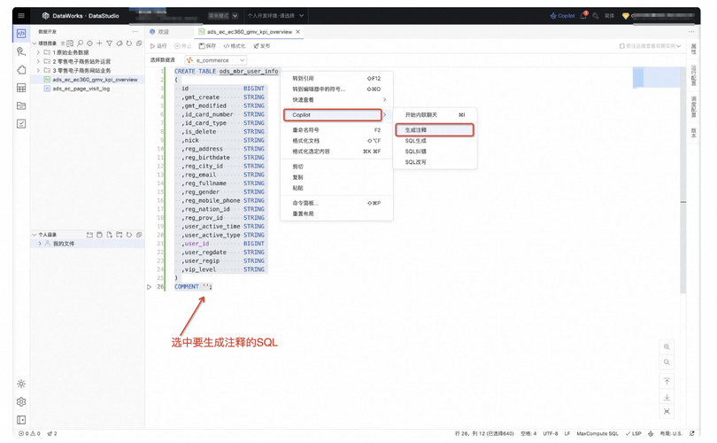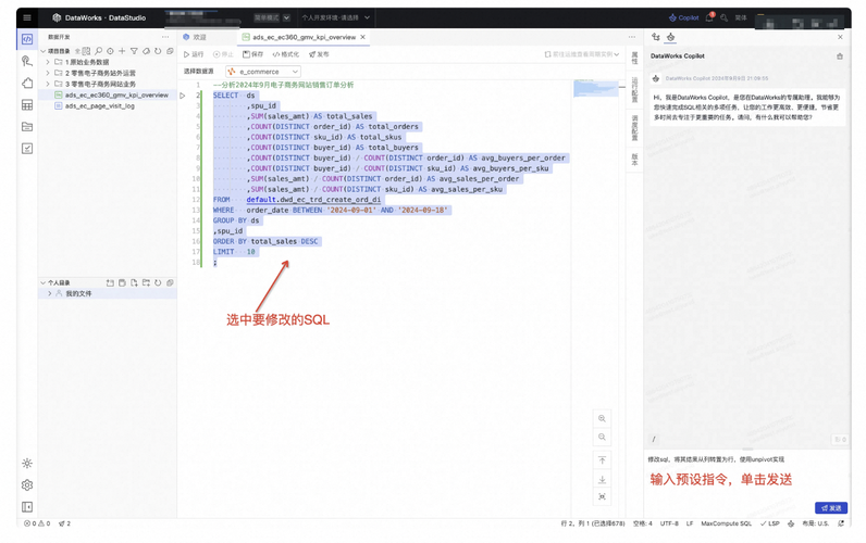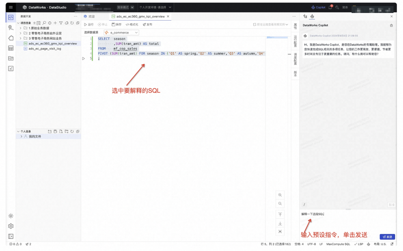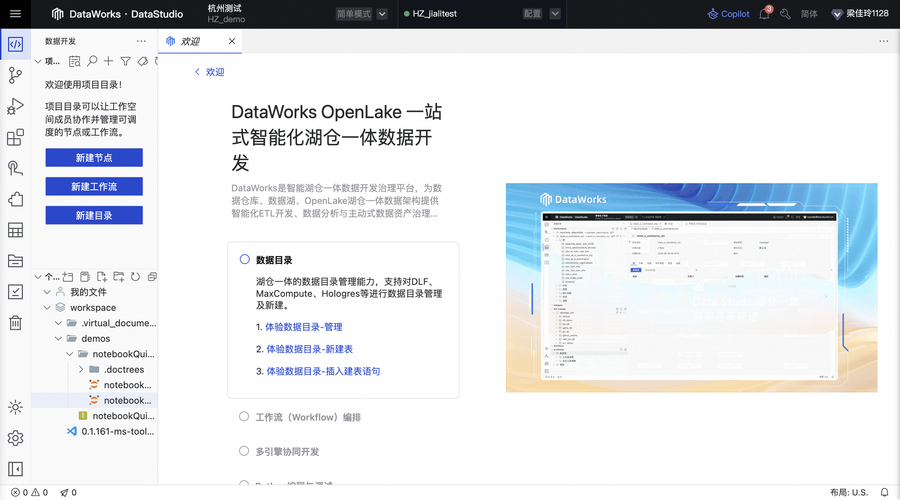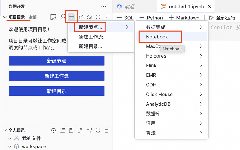 DataWorks Notebook是智能化交互式数据开发和分析工具,能够面向多种数据引擎开展SQL或Python分析,即时运行或调试代码,获取可视化数据结果。同时,DataWorks Notebook能够与其他任务节点混合编排为工作流,提交至调度系统运行,助力复杂业务场景的灵活实现。DataWorks Copilot是您在DataWorks的智能助手,当前阶段可根据自然语言快速转换为需要的SQL命令,包括SQL生成、SQL改写、SQL纠错、生成注释等,帮助您轻松高效地完成数据ETL及数据分析工作。